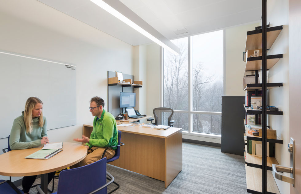 The interior features a variety of materials, including granite, terrazzo, wood flooring, carpet tile, and sheet rubber. The color scheme is primarily leafy greens, echoing the campus environment, and is complemented by blues, teals, and purples. These colors are carried through the furniture in the building. The project included 80 faculty offices, each with individualized configurations and fabrics and fabric selections.