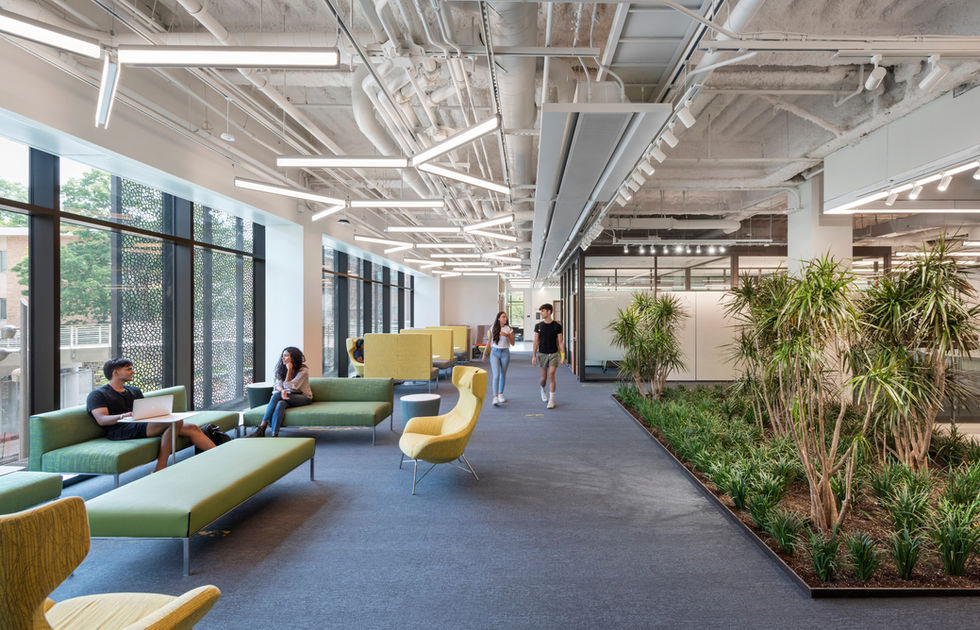 The furniture includes a large variety of types and supports individuals, and small to large groups for working and collaborating. There are live interior gardens flanking a central connecting staircase with walking pathways and adjacent seating areas.