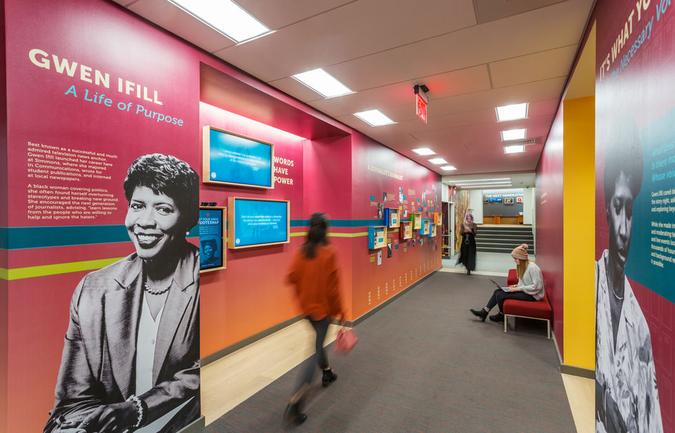 The college is named for one of the University’s most distinguished alumnae, Gwen Ifill and is dedicated to art, language, music, film and contemporary media. The building includes a graphic design studio, computer classroom, computer lab, break out areas and niches, renovated auditorium and administrative offices. There is a large state-of-the-art boardroom that seats over forty people plus the dean’s suite. The main corridor is filled with graphics that display the life and accomplishments from Gwen Ifill’s career.