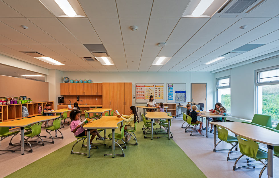 Crocker Elementary School is a new 116,000-square-foot facility serving 845 students in grades 1–5. The school embraces a biophilic design approach that integrates nature into the learning environment. Multiple “biomes” are distributed across grade levels, each defined by a distinct color palette expressed through coordinated furniture fabrics and finishes. Program spaces include classrooms, dedicated STE and art rooms, and a cafetorium designed to transform seamlessly from lunch service to assemblies and school performances. Collaborative support areas foster creativity and engagement, while the library features moveable curved bookcases that shape flexible zones for reading, exploration, and group activity.