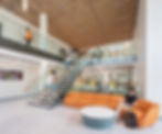 The furniture includes a large variety of types and supports individuals, and small to large groups for working and collaborating. There are live interior gardens flanking a central connecting staircase with walking pathways and adjacent seating areas.